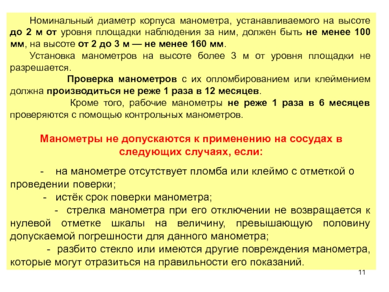 Слайд 11 Номинальный диаметр корпуса манометра, устанавливаемого на высоте до 2