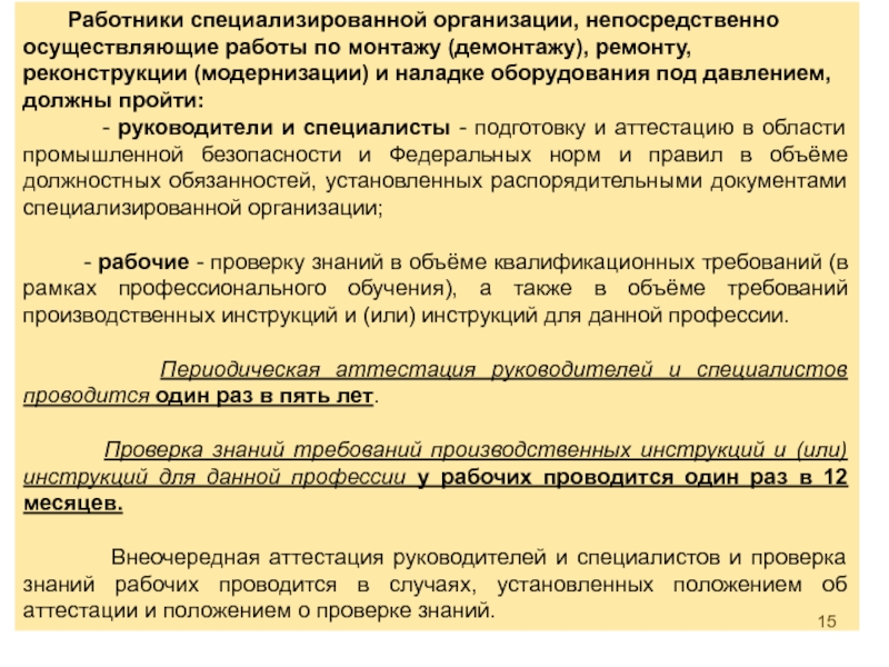 Подготовка эксплуатационного персонала должна осуществляться в соответствии с требованиями Положения об организации обучения и проверки знаний рабочих организаций, поднадзорных Федеральной службе по экологическому, технологическому и атомному надзору (утв. приказом Ростехнадзора от 29.01.2007 N 37) и в соответствии с требованиями других нормативных правовых актов и нормативно-технических документов.