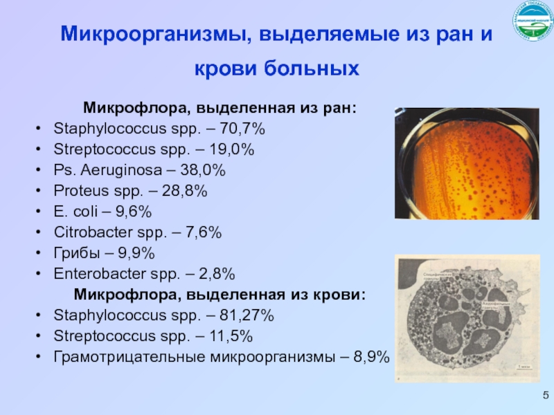 Слайд 5Микроорганизмы, выделяемые из ран и крови больных