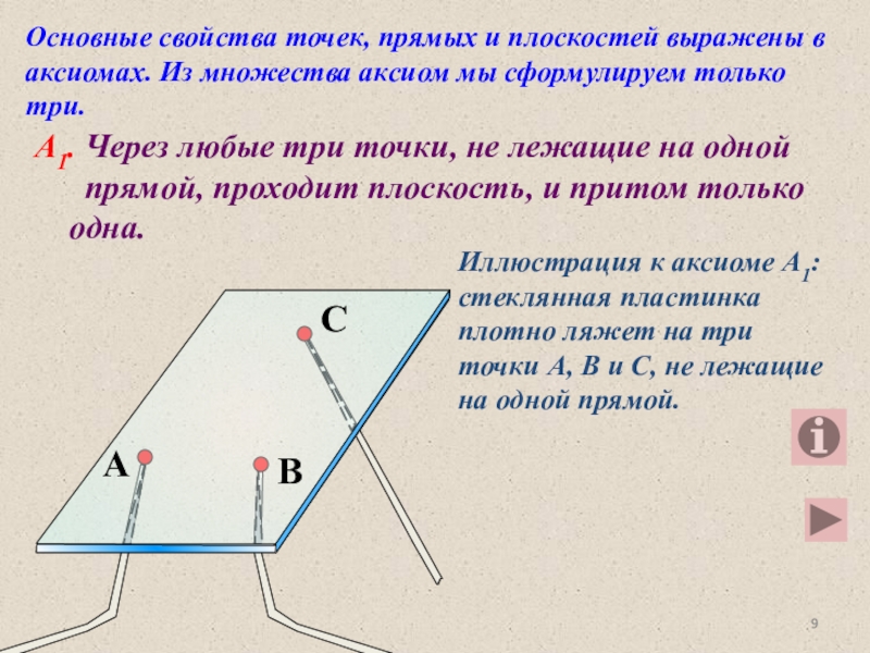 Иллюстрация к аксиоме А1: стеклянная пластинка плотно ляжет на три точки А, В и С, не лежащие на одной прямой.