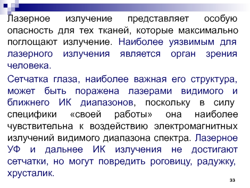Слайд 33Лазерное излучение представляет особую опасность для тех тканей, которые максимально