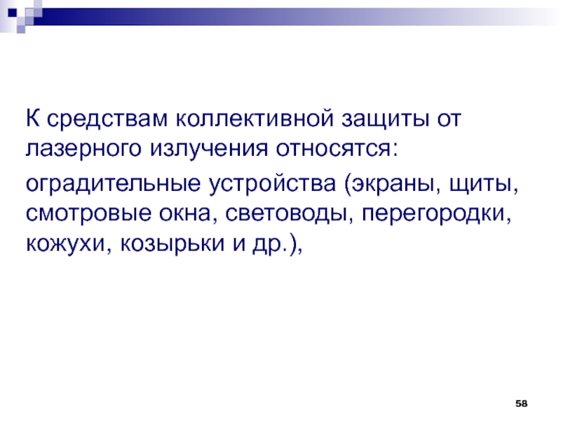Слайд 58К средствам коллективной защиты от лазерного излучения относятся: