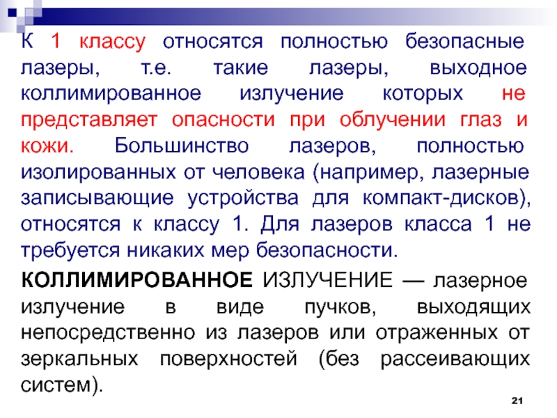 Слайд 21К 1 классу относятся полностью безопасные лазеры, т.е. такие лазеры,