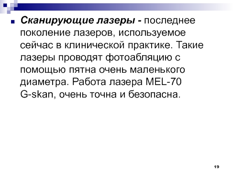 Слайд 19Сканирующие лазеры - последнее поколение лазеров, используемое сейчас в клинической