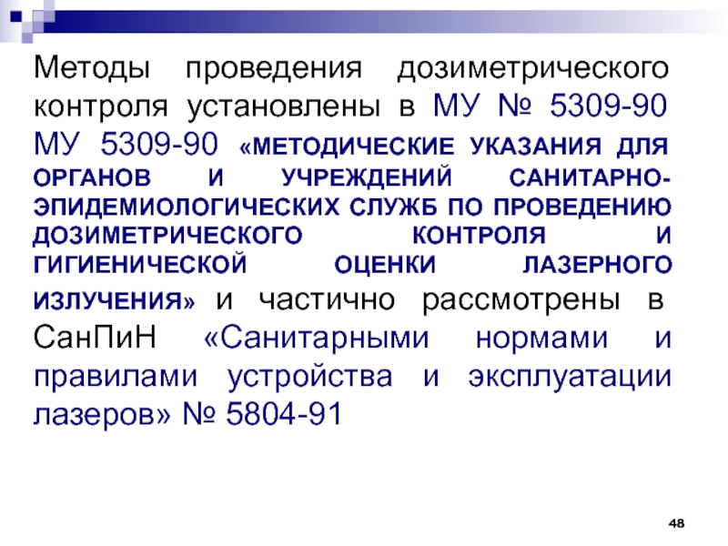 Слайд 48Методы проведения дозиметрического контроля установлены в МУ № 5309-90 МУ