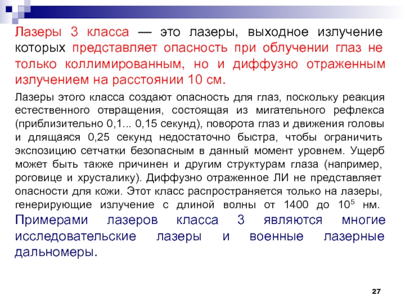 Слайд 27Лазеры 3 класса — это лазеры, выходное излучение которых представляет