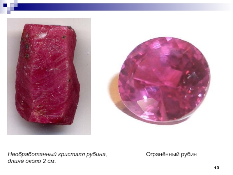 Слайд 13Необработанный кристалл рубина, длина около 2 см.