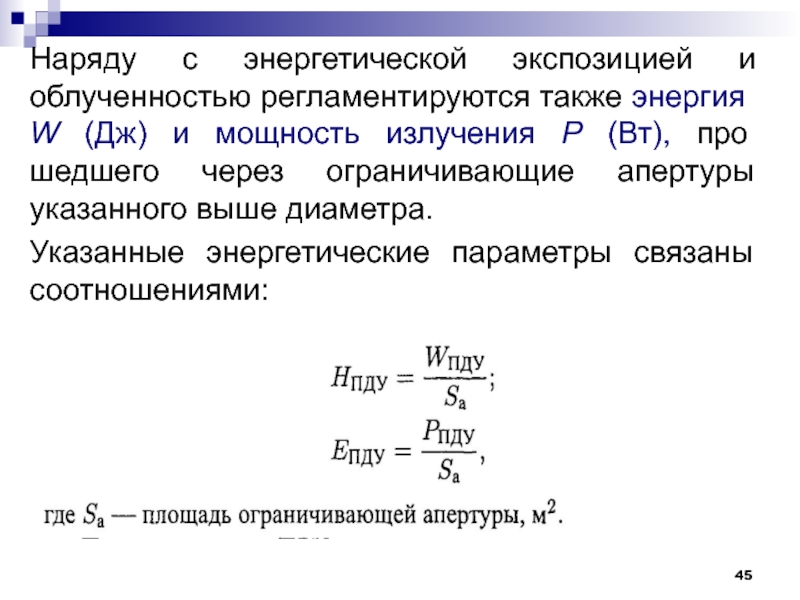 Слайд 45Наряду с энергетической экспозицией и облученностью регламентируются также энергия W