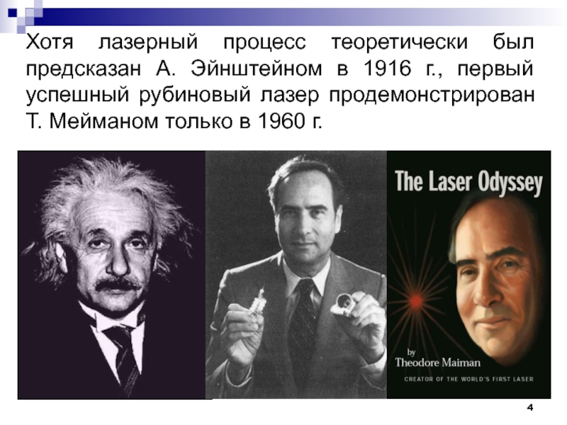 Слайд 4Хотя лазерный процесс теоретически был предсказан А. Эйнштейном в 1916