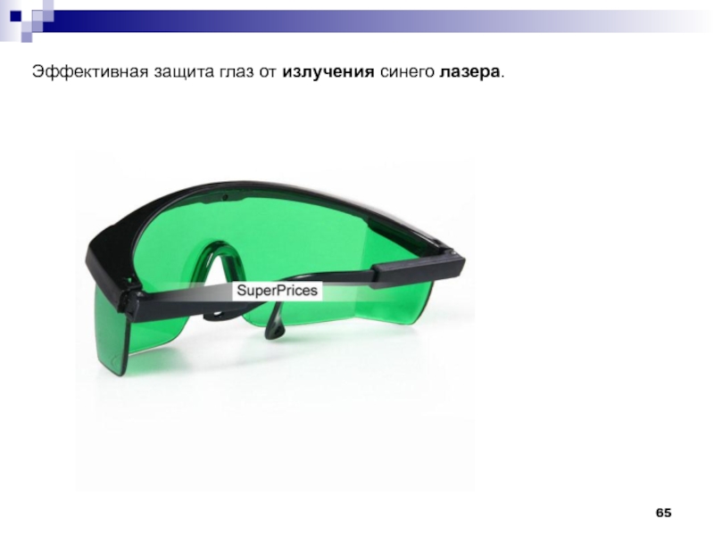 Слайд 65Эффективная защита глаз от излучения синего лазера.