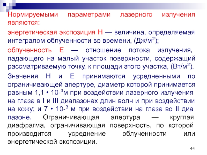 Слайд 44Нормируемыми параметрами лазерного излучения являются: