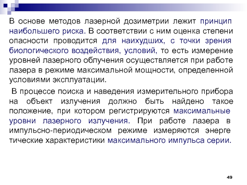 Слайд 49В основе методов лазерной дозиметрии лежит принцип наибольшего риска. В