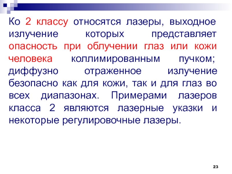 Слайд 23Ко 2 классу относятся лазеры, выходное излучение которых представляет опасность
