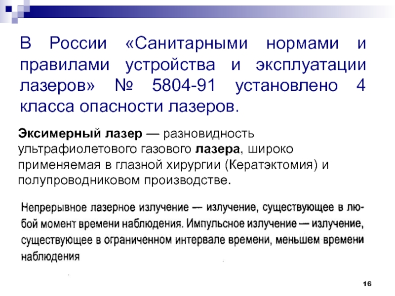 Слайд 16В России «Санитарными нормами и правилами устройства и эксплуатации лазеров»