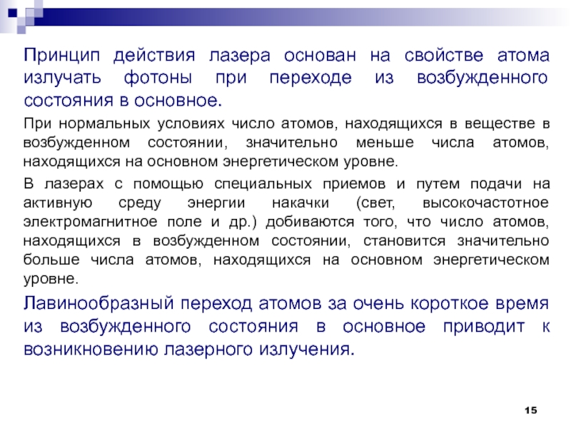 Слайд 15Принцип действия лазера основан на свойстве атома излучать фотоны при