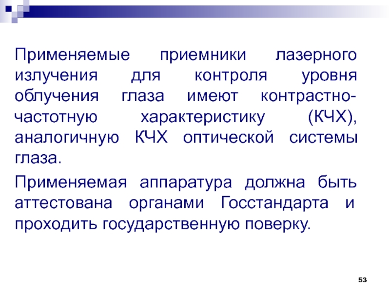 Слайд 53Применяемые приемники лазерного излучения для контроля уровня облучения глаза имеют