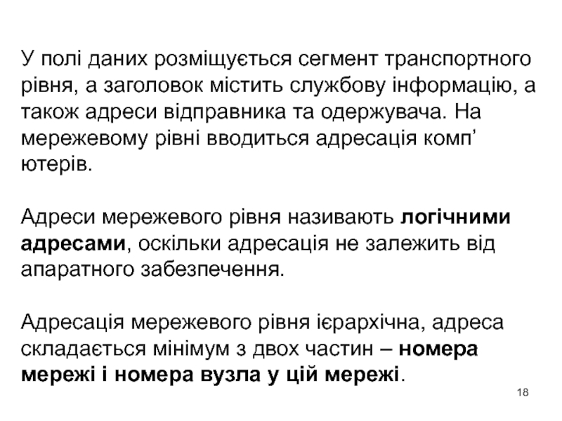 Слайд 18У полі даних розміщується сегмент транспортного рівня, а заголовок містить