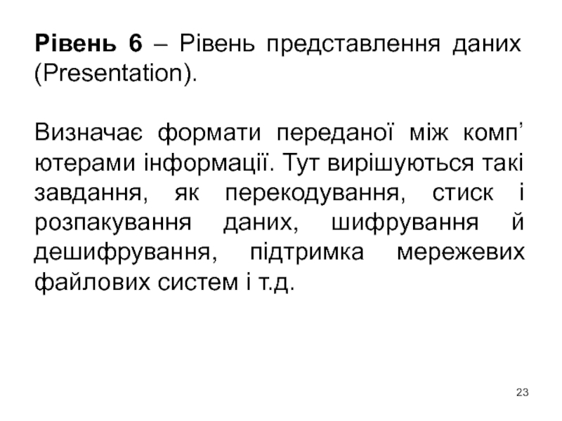 Слайд 23Рівень 6 – Рівень представлення даних (Presentation).
