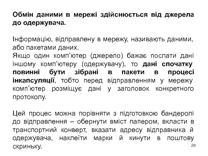 Слайд 26Обмін даними в мережі здійснюється від джерела до одержувача.