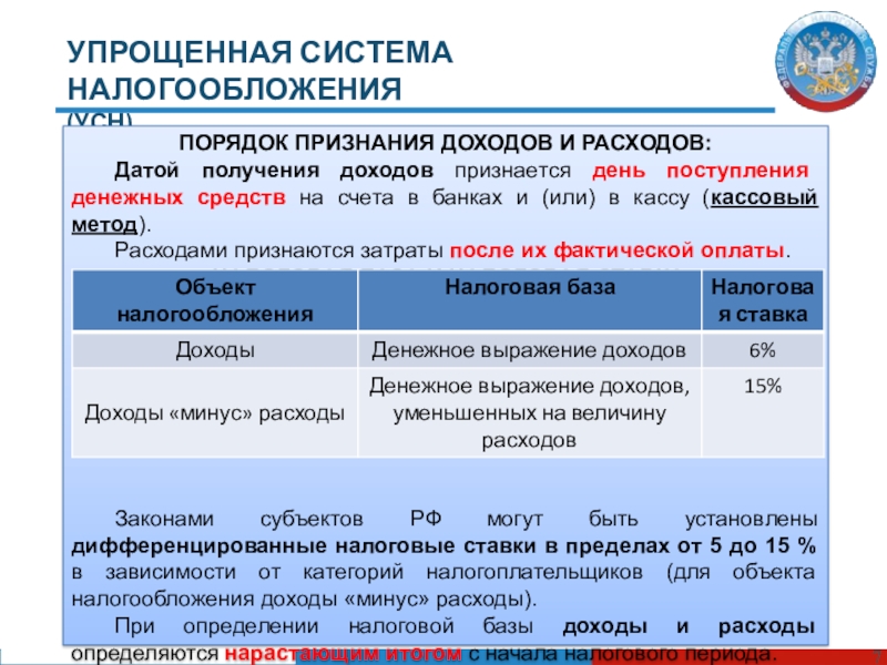 Законами субъектов РФ могут быть установлены дифференцированные налоговые ставки в пределах от 5 до 15 % в зависимости от категорий налогоплательщиков (для объекта налогообложения доходы «минус» расходы).