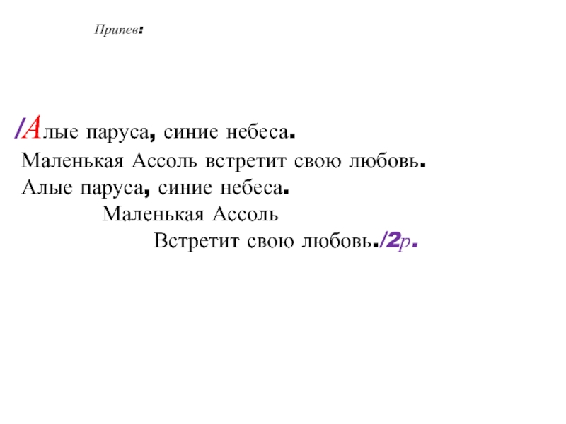 В волшебной стране и далёкой Где солнце, тепло и вода. У самого синего моря Простая девчонка жила. Она так поверила в чудо, Что утром однажды вдали, /Кораблик покажется под парусами Алого цвета зари./2р.
