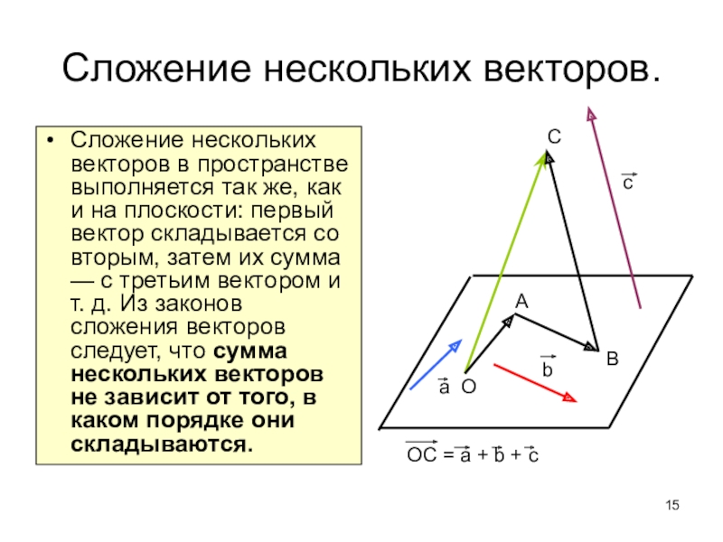 их сумма — с третьим вектором и т. д. Из законов сложения векторов следует, что сумма нескольких векторов не зависит от того, в каком порядке они складываются.