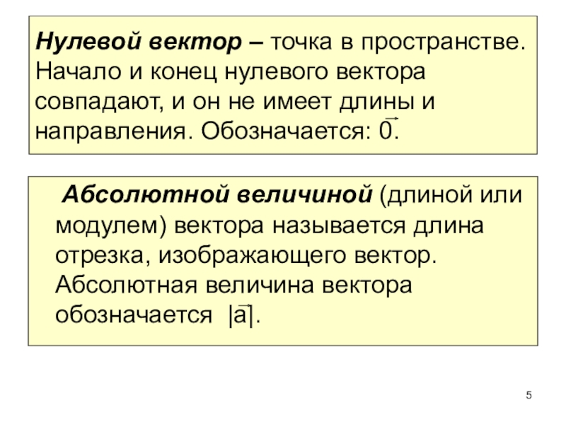 Слайд 5Нулевой вектор – точка в пространстве. Начало и конец нулевого