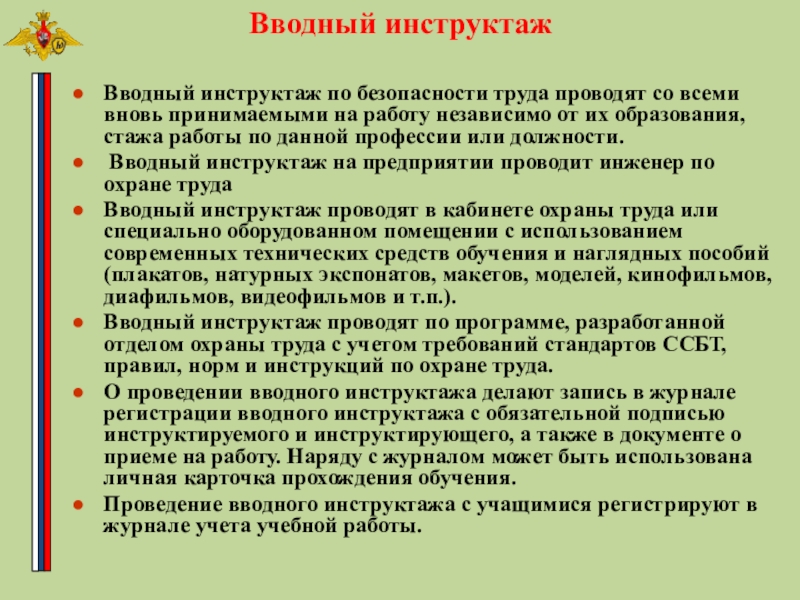 Основные задачи проведения вводного инструктажа