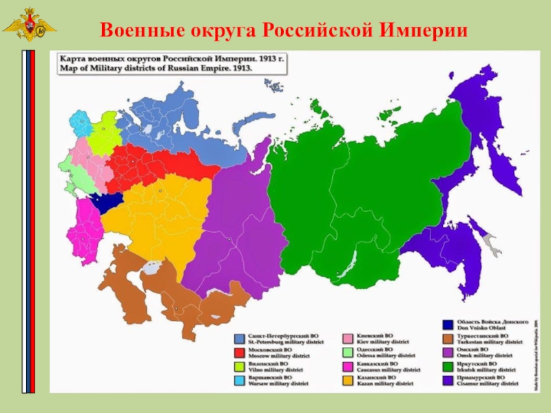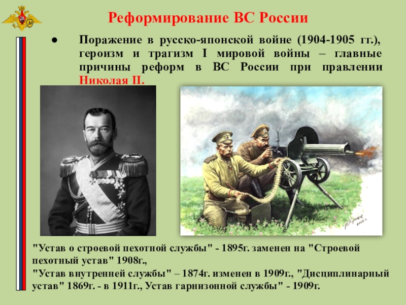"Устав внутренней службы" – 1874г. изменен в 1909г., "Дисциплинарный устав" 1869г. - в 1911г., Устав гарнизонной службы" - 1909г.