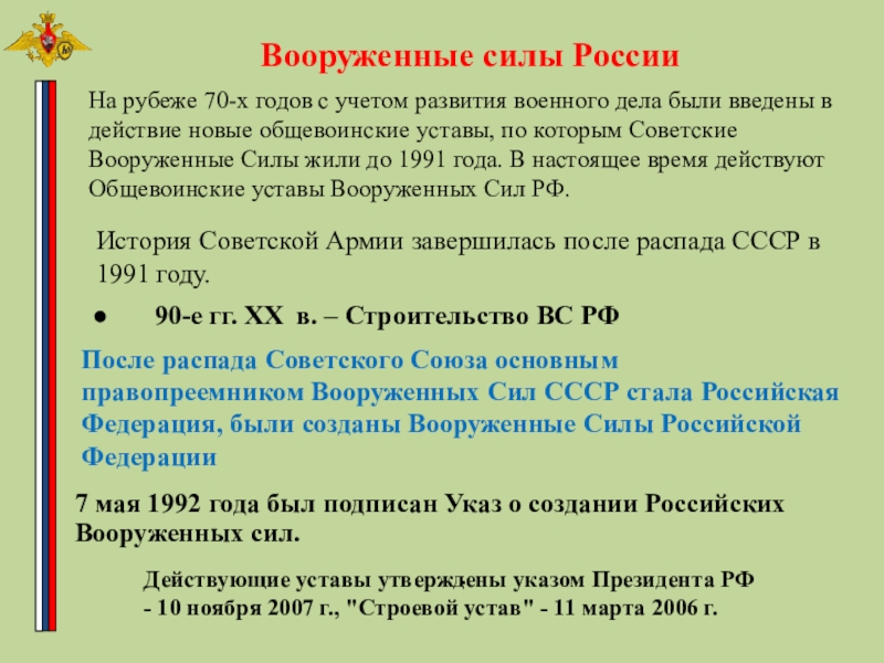 На рубеже 70-х годов с учетом развития военного дела были введены в действие новые общевоинские уставы, по которым Советские Вооруженные Силы жили до 1991 года. В настоящее время действуют Общевоинские уставы Вооруженных Сил РФ.