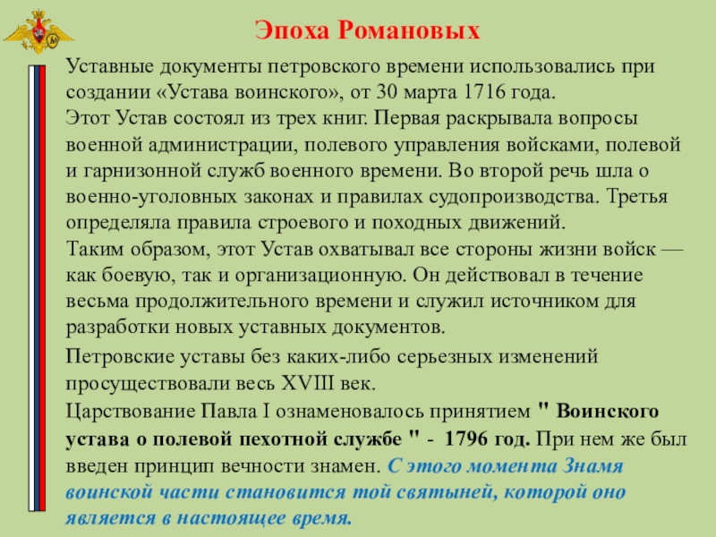 Этот Устав состоял из трех книг. Первая раскрывала вопросы военной администрации, полевого управления войсками, полевой и гарнизонной служб военного времени. Во второй речь шла о военно-уголовных законах и правилах судопроизводства. Третья определяла правила строевого и походных движений.