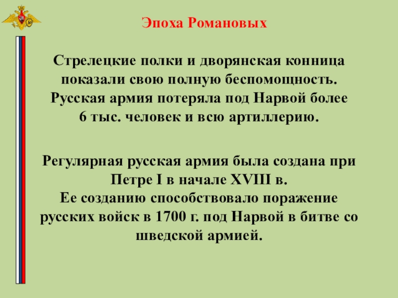 Регулярная русская армия была создана при Петре I в начале XVIII в.