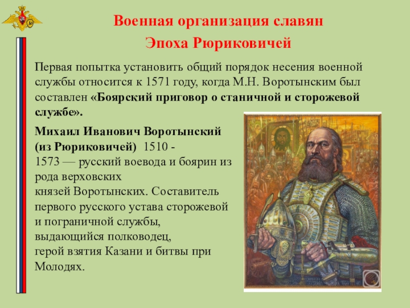 Михаил Иванович Воротынский (из Рюриковичей) 1510 - 1573 — русский воевода и боярин из рода верховских князей Воротынских. Составитель первого русского устава сторожевой и пограничной службы, выдающийся полководец, герой взятия Казани и битвы при Молодях.