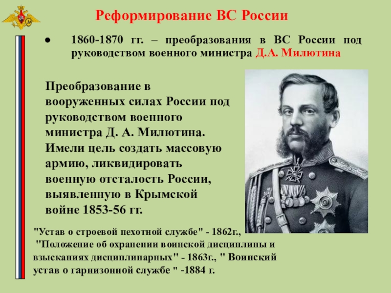 1860-1870 гг. – преобразования в ВС России под руководством военного министра Д.А. Милютина
