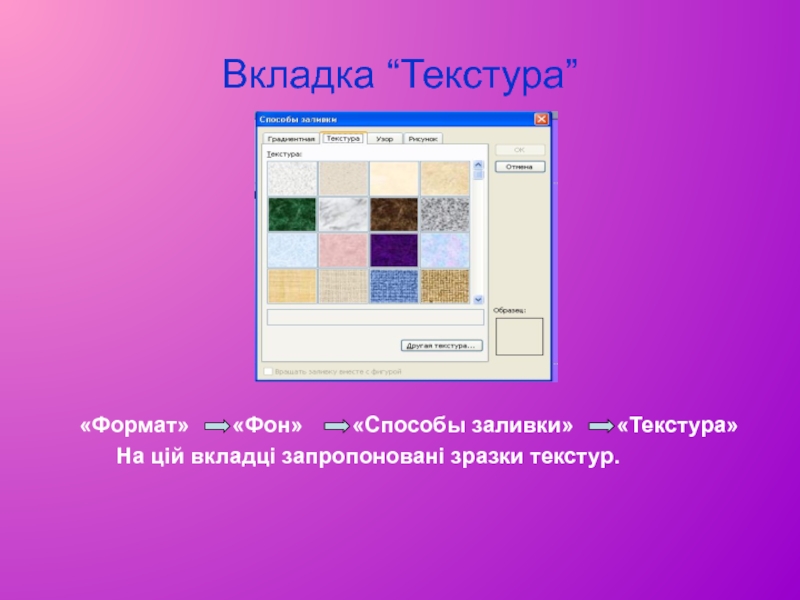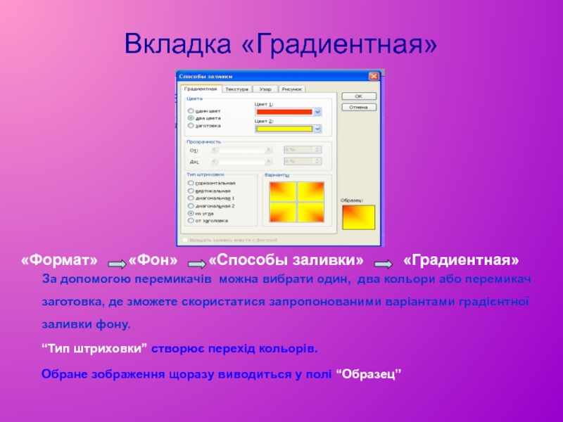 Команда “Способы заливки” цього списку відкриває однойменне вікно