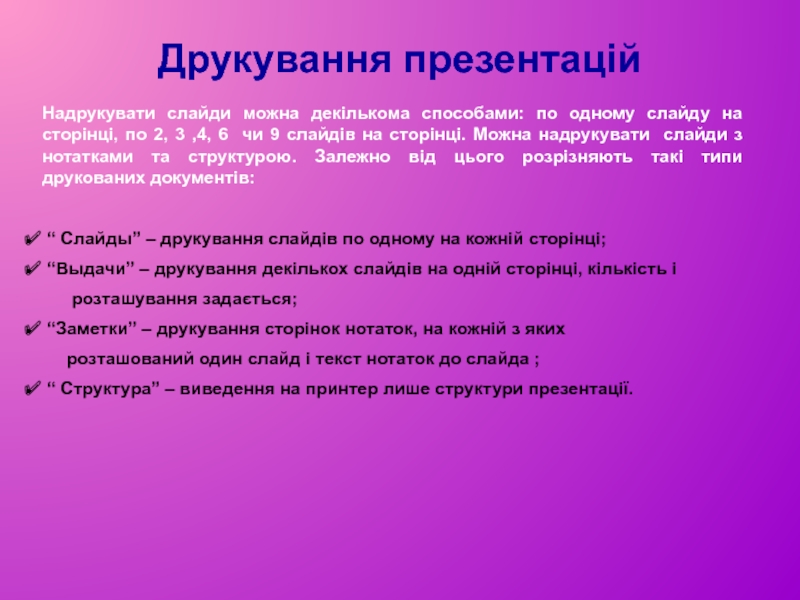 сторінці. Можна надрукувати слайди з нотатками та структурою. Залежно від цього розрізняють такі типи друкованих документів: