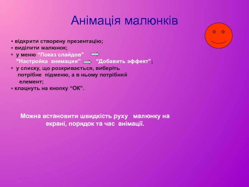 Можна встановити швидкість руху малюнку на екрані, порядок та час анімації.