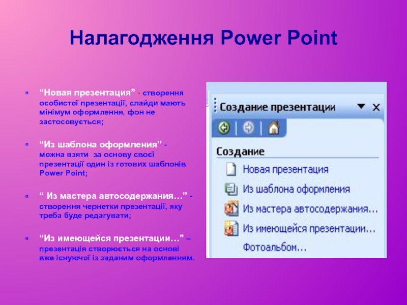 “Из имеющейся презентации…” – презентація створюється на основі вже існуючої із заданим оформленням.