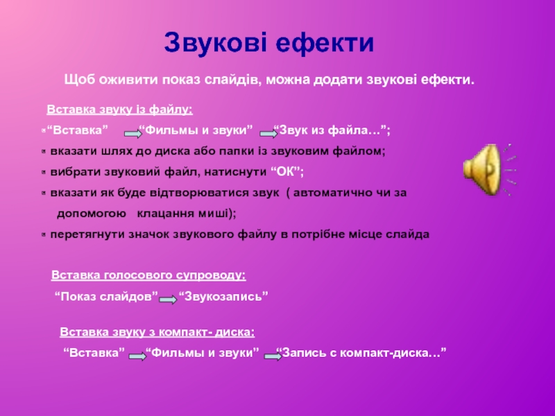 Щоб оживити показ слайдів, можна додати звукові ефекти.
