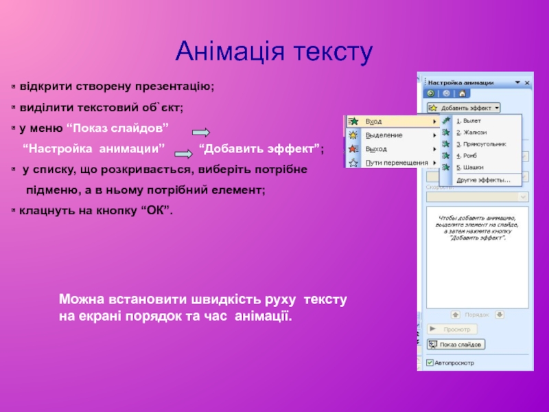 Можна встановити швидкість руху тексту на екрані порядок та час анімації.