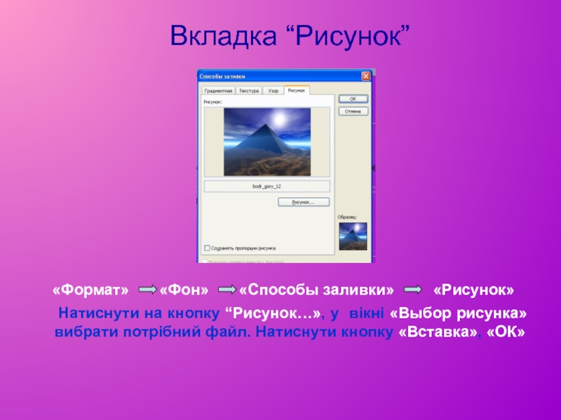 на кнопку “Рисунок…», у вікні «Выбор рисунка» вибрати потрібний файл. Натиснути кнопку «Вставка», «ОК»