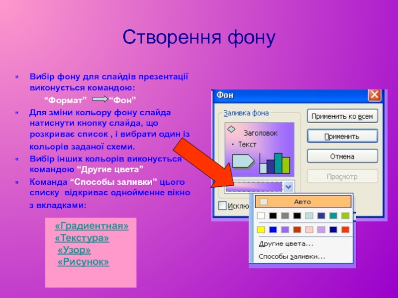 кольору фону слайда натиснути кнопку слайда, що розкриває список , і вибрати один із