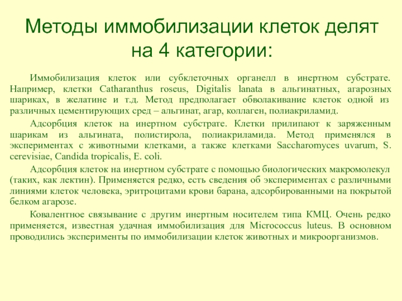 Слайд 47Методы иммобилизации клеток делят на 4 категории: