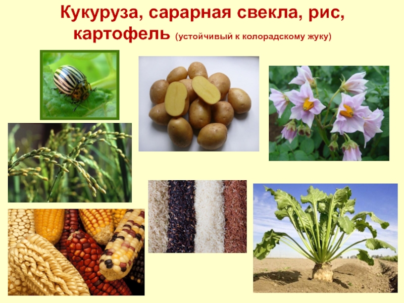 Слайд 14Кукуруза, сарарная свекла, рис, картофель (устойчивый к колорадскому жуку)