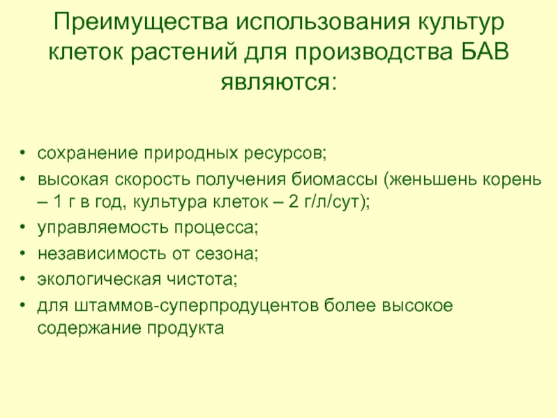 Слайд 43Преимущества использования культур клеток растений для производства БАВ являются: