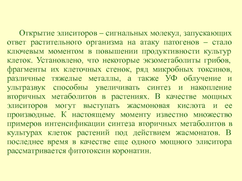 клеток. Установлено, что некоторые экзометаболиты грибов, фрагменты их клеточных стенок, ряд микробных токсинов, различные тяжелые металлы, а также УФ облучение и ультразвук способны увеличивать синтез и накопление вторичных метаболитов в растениях. В качестве мощных элиситоров могут выступать жасмоновая кислота и ее производные. К настоящему моменту известно множество примеров интенсификации синтеза вторичных метаболитов в культурах клеток растений под действием жасмонатов. В последнее время в качестве еще одного мощного элиситора рассматривается фитотоксин коронатин.
