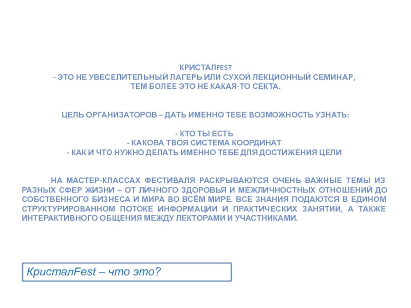 На мастер-классах фестиваля раскрываются очень важные темы из разных сфер жизни – от личного здоровья и межличностных отношений до собственного бизнеса и мира во всём мире. Все знания подаются в едином структурированном потоке информации и практических занятий, а также интерактивного общения между лекторами и участниками.
