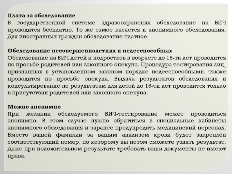 Обследование на ВИЧ детей и подростков в возрасте до 16-ти лет проводится по просьбе родителей или законного опекуна. Процедура тестирования лиц¸ признанных в установленном законом порядке недееспособными, также проводится по просьбе опекуна. Выдача результатов обследования и консультирование по результатам для детей до 16-ти лет проводится только в присутствии родителей или законного опекуна.
