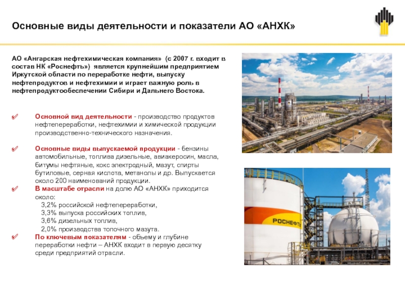 «Роснефть») является крупнейшим предприятием Иркутской области по переработке нефти, выпуску нефтепродуктов и нефтехимии и играет важную роль в нефтепродуктообеспечении Сибири и Дальнего Востока.Основной вид деятельности - производство продуктов нефтепереработки, нефтехимии и химической продукции производственно-технического назначения.