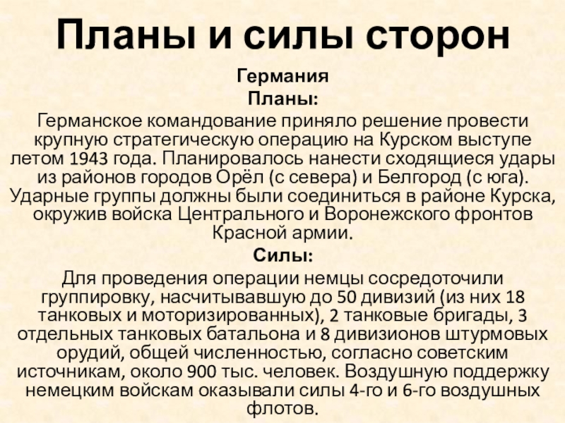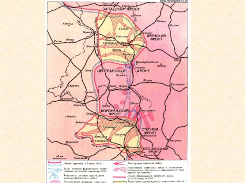 удары из районов городов Орёл (с севера) и Белгород (с юга). Ударные группы должны были соединиться в районе Курска, окружив войска Центрального и Воронежского фронтов Красной армии.